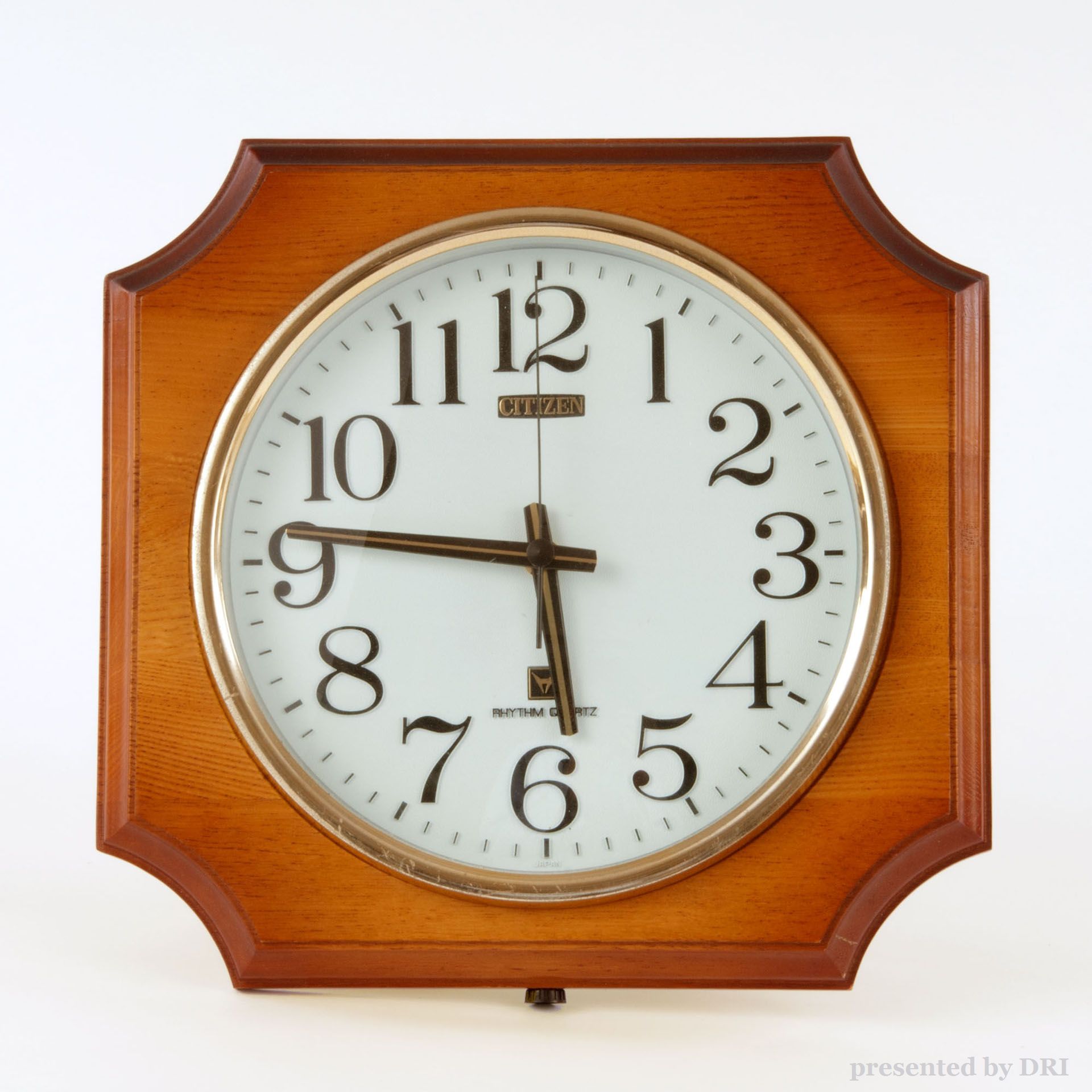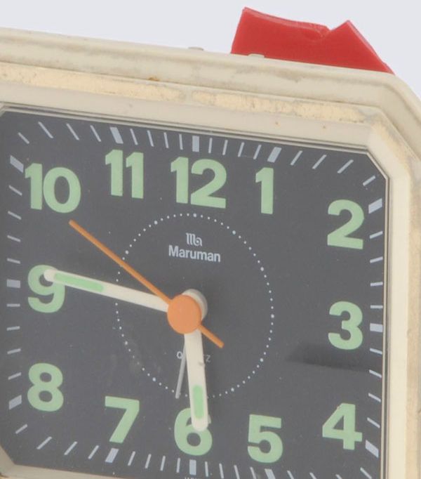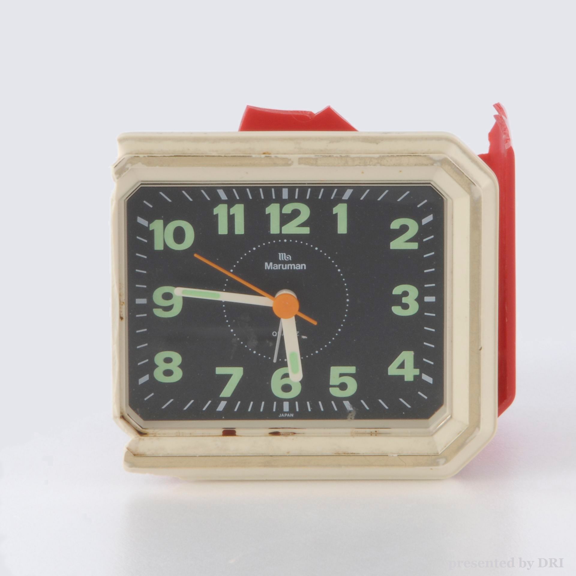 An alarm clock which was destroyed under a fallen chest of drawers. Its hands are showing 5:46, the time of the earthquake occurrence.