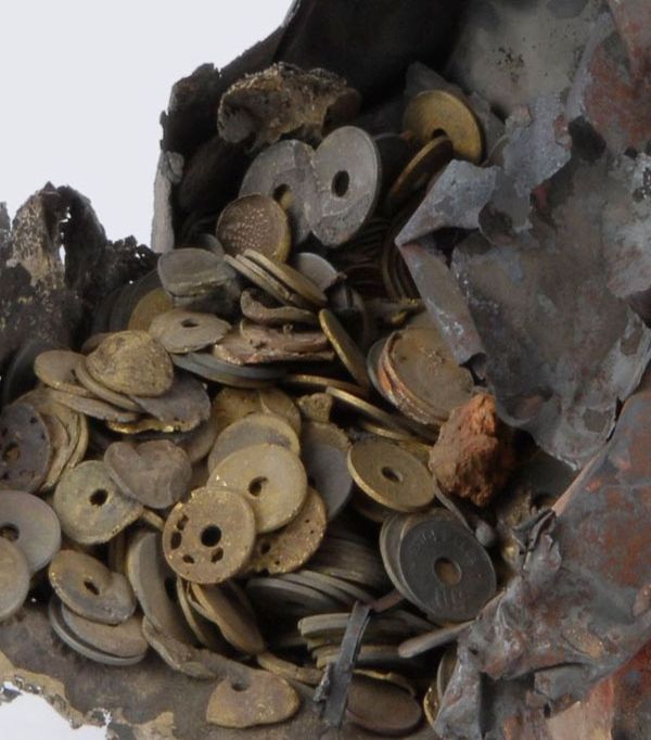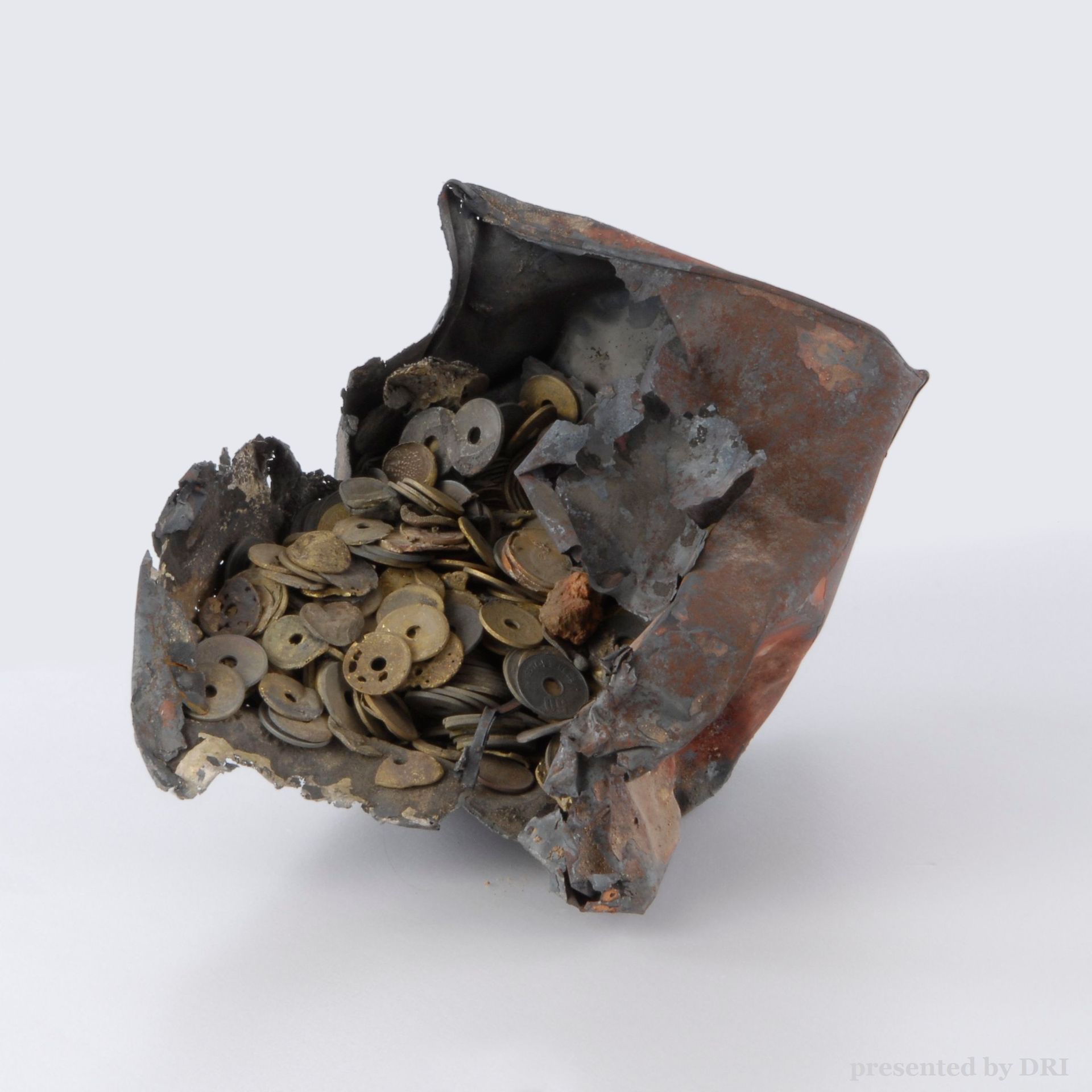 The coins in a moneybox can were burnt altogether by the fire which broke out after the earthquake. All we could gather from the ruins of the fire were such coins or other metal goods.