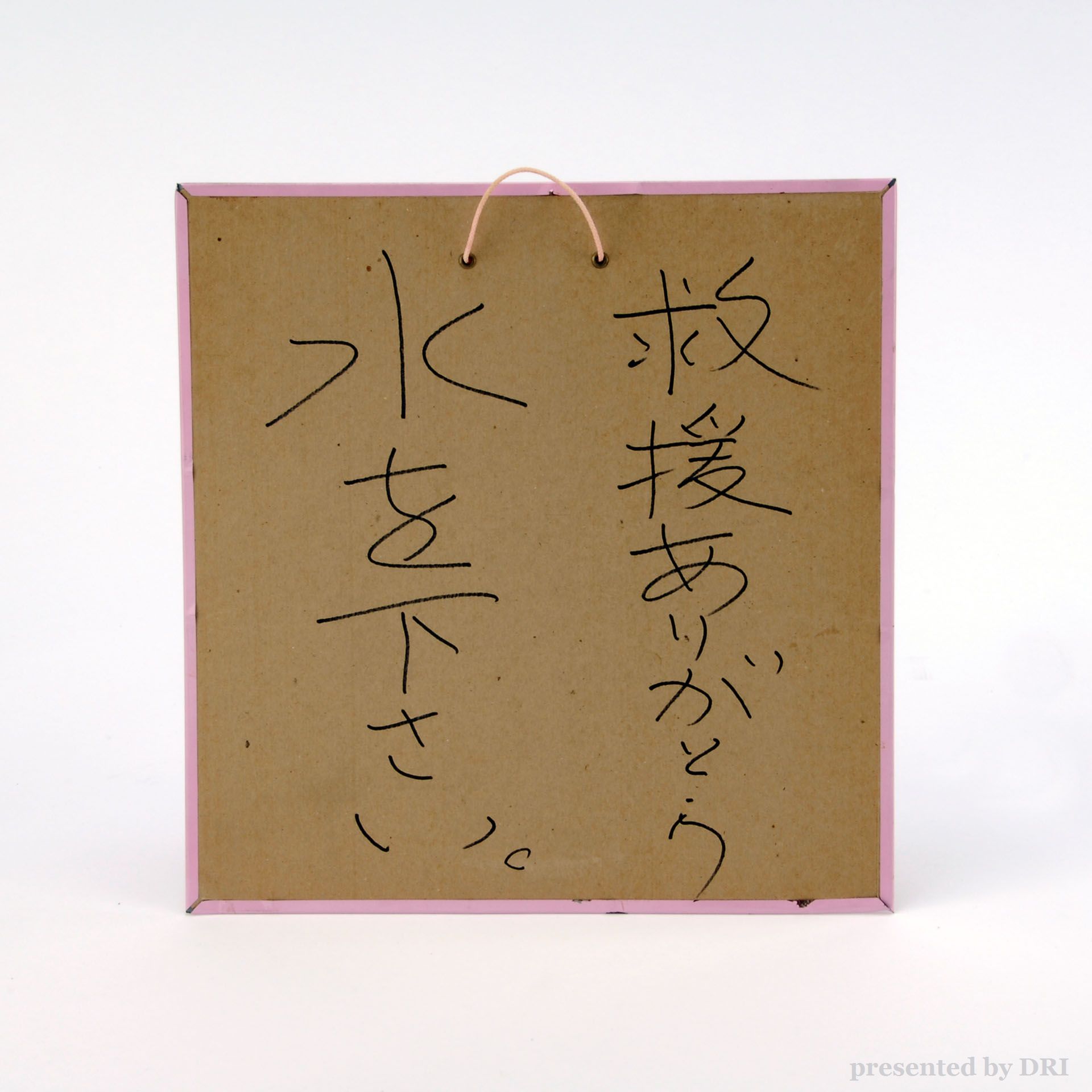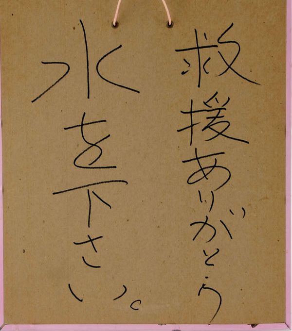 A victim wrote a message to appeal lack of water towards running Self-Defense Forces vehicles. Sometime within a week after the earthquake.