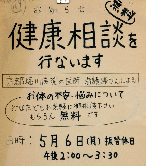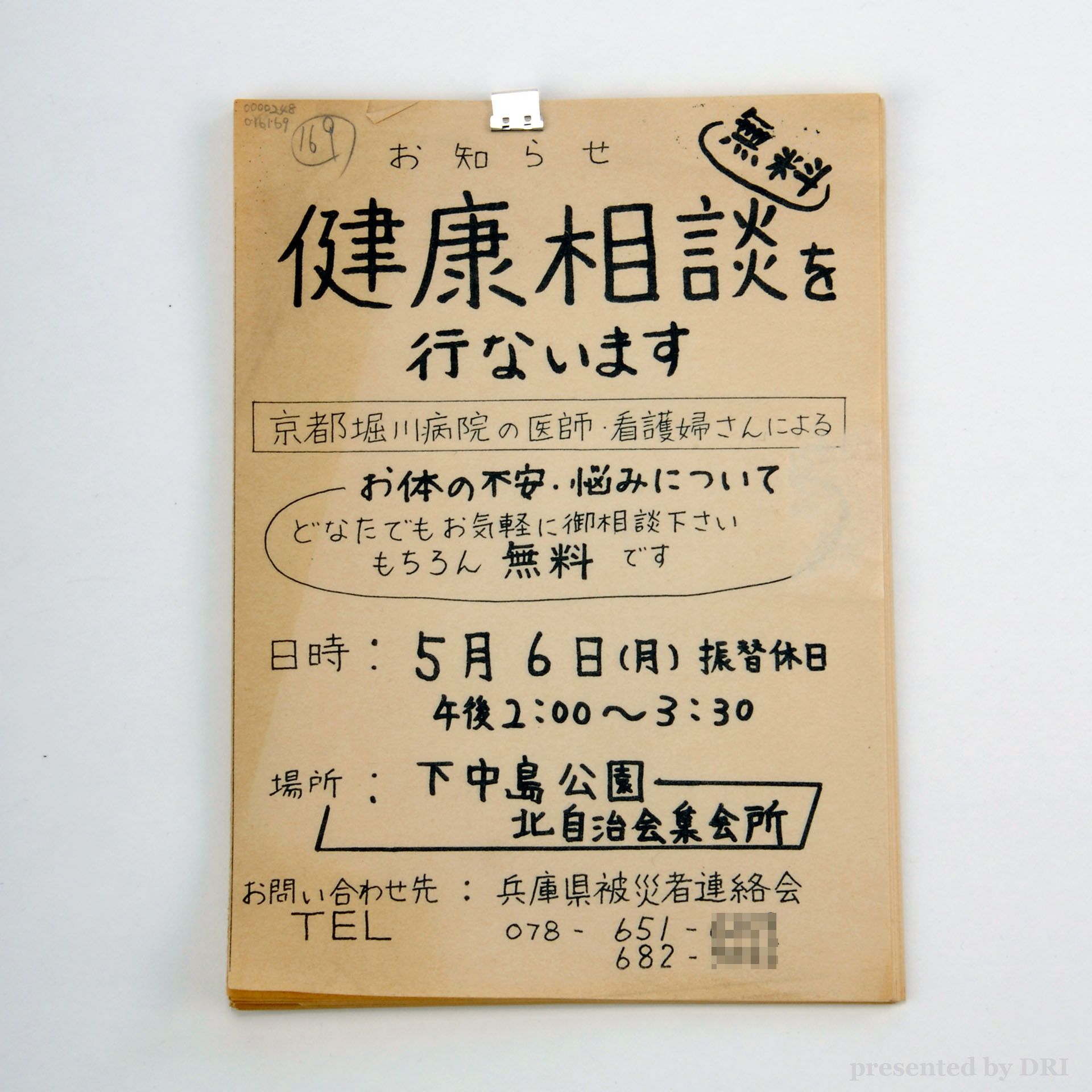 A notice to announce a free health consultation for the residents of temporary houses. May, 1996.